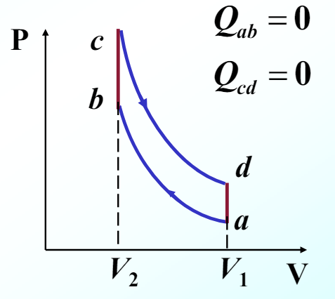 第三步,爆燃气体绝热膨胀 \(c\to d\),气体对外做功,\(V_2\to V_1\)。(视为绝热同第一步)