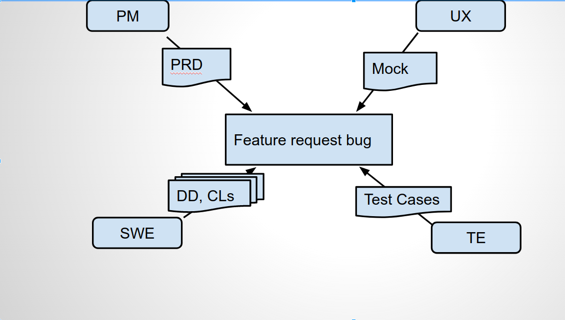 每个新功能都建立一个新功能类别的bug,让所有参与人有一个统一的沟通渠道,保证信息是同步的