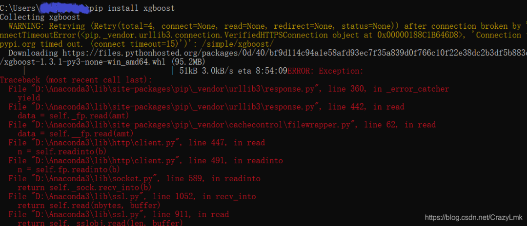 打开 cmd 命令模式,输入 pip install xgboost但网络需要架梯子(不知道是不是我的网不好),我不架梯子会因网络问题出现以下报错: