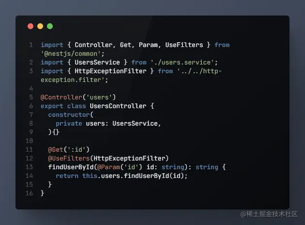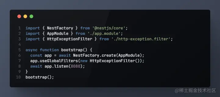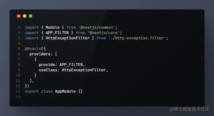 全局范围绑定过滤器提供了两种方式,一种是通过app实例调用useGlobalFilters函数绑定,缺点是在任何模块外进行注册的过滤器不能注入依赖;另一种方式就是将过滤器绑定到根模块。