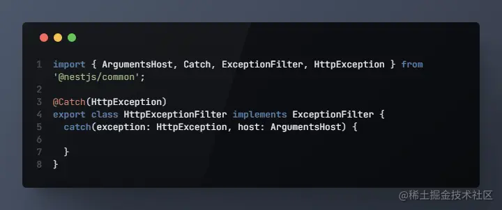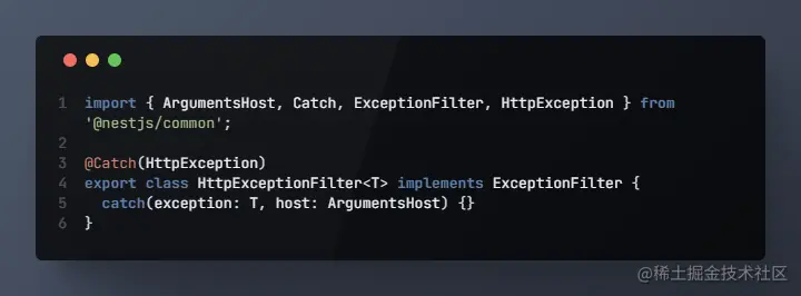 通过使用 CLI 指令:nest g f http-exception,创建如下的过滤器: