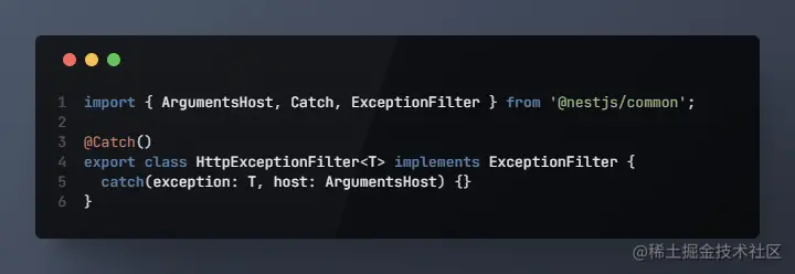自定义的过滤器通过 @Catch() 装饰器约束所需要被拦截的异常类,当此装饰器不约束特定的异常类时则表示拦截任何一个异常: