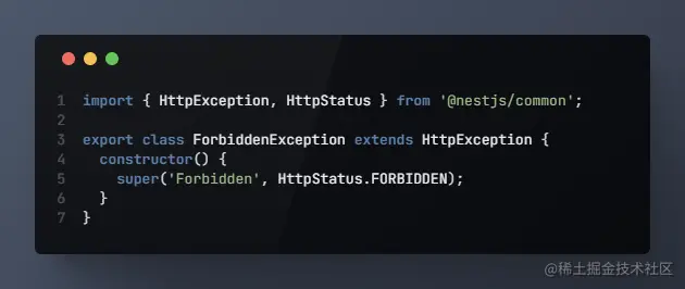 自定义异常类需要继承 Nest 内置的基础异常类(HttpException)后进行定义,体现了面向对象中继承和重写的两大重要概念。