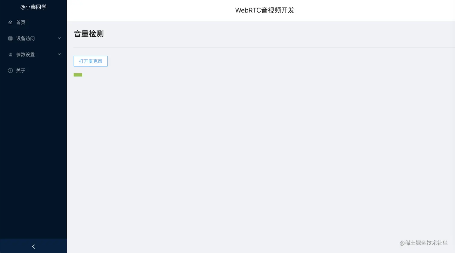提供一个启动麦克风的按钮事件和一个用来显示音量的 div 元素,通过动态改变元素的宽度来实时显示。