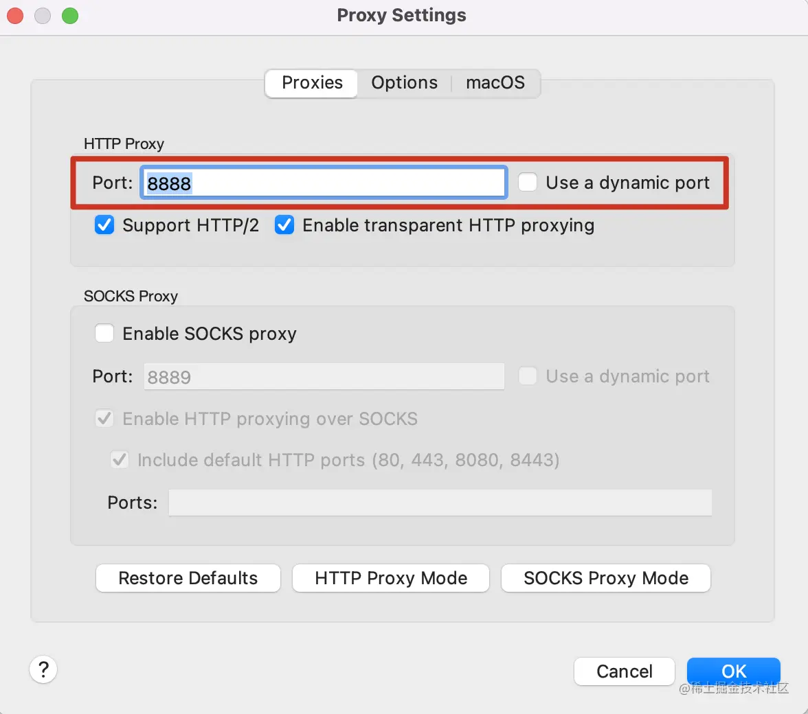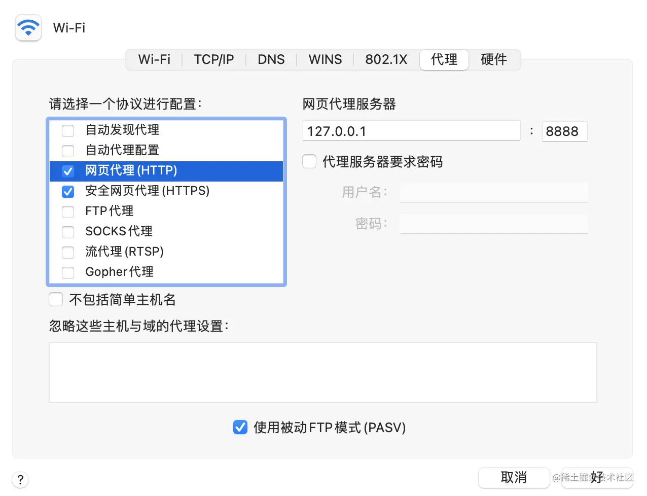 当开启了代理后在 macOS 的【网络偏好设置】=>【高级】=>【代理】中将看到下图已被自动配置好了。我们要关注一下这个端口号,因为在前端开发的一些项目在启动后可能会占用掉 8888 端口。
