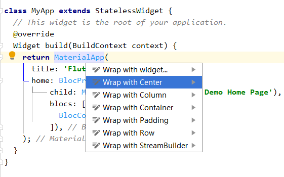 3. 使用: 选中某个Widget鼠标右键选中第一项ShowContext Actions,可为此Widget快速包裹一层指定/自定的Widget,省的找括号