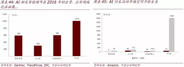 AI 加速新应用诞生,空间不容小觑:借助 AI 算法工具,例如语音识别、机器视觉、3D 导航等,智能音箱、无人机、VR、共享单车、智能摄像头……我们熟悉的智能硬件都在 性能和用户体验上拥有明显提升,而成本的增加微乎其微。以大疆 Spark 为例,其售价 仅为 3,299 元,但拥有更先进的手势识别功能。未来,判断 AI 将应用于更多的消费电子 领域。此类智能设备领域虽然当前尚未放量(年出货规模在 1,000 万台以下),市场规模 在 100 亿美元以下,但总体规模依旧不容忽视,据 IDC 预测,2020 年仅 AR/VR 可望成 长至千亿美元(vs. 2016 年的 52 亿美元)。