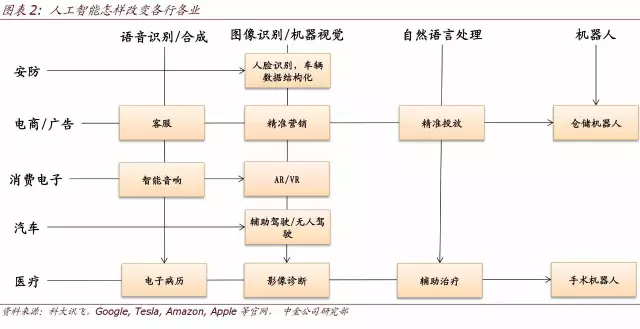 在这份报告里,我们着重分析四种人工智能技术(语音,图像,自然语言处理,机器人) 对五个行业(安防,互联网电商/广告,消费电子,汽车,医疗)的影响(图表 2)。