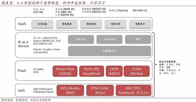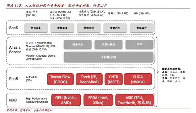 ► 软件开发框架:主要的框架包括谷歌的 TensorFlow,Facebook,IBM,谷歌 DeepMind 支持的Torch,Microsoft 的 CNTK,Amazon 的 MXNet。NVidia 也提供自己的软件开 发框架 CUDA。这些公司之间的竞争类似于智能手机操作系统上 iOS/Andorid 之间的 竞争。