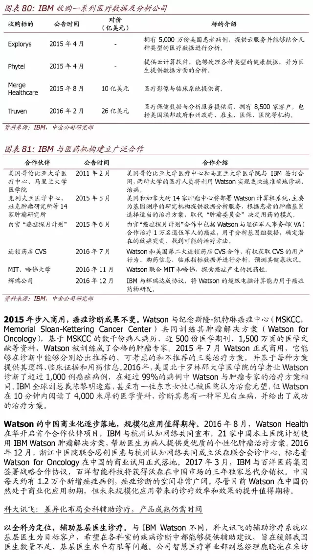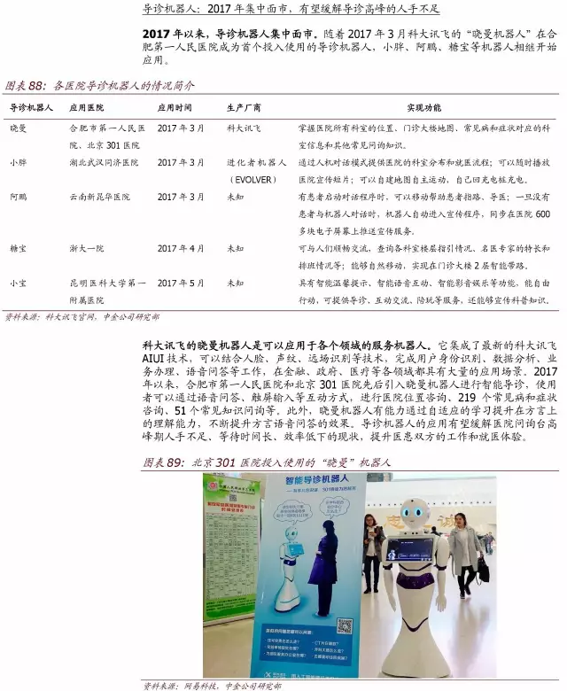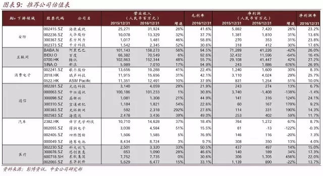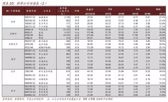 数据比算法重要:我们认为人工智能的商业化,仅仅依靠技术是 很难继续走下去的。数据的规模和采集能力决定了人工智能在这 个行业的发展速度。在这方面,感谢线上消费的发展和十几年平安城市建设,互联网和安防行业的智能化走在了其他行业前面。看好海康威视、大华股份、科大讯飞、东方网力、千方科技、阿里巴巴、腾讯、新浪在安防和互联网行业的 AI 变现机会。医疗大数据是下一个热点,看好东软、思创医惠和东华软件在医疗大数据领域的长期成长机会。