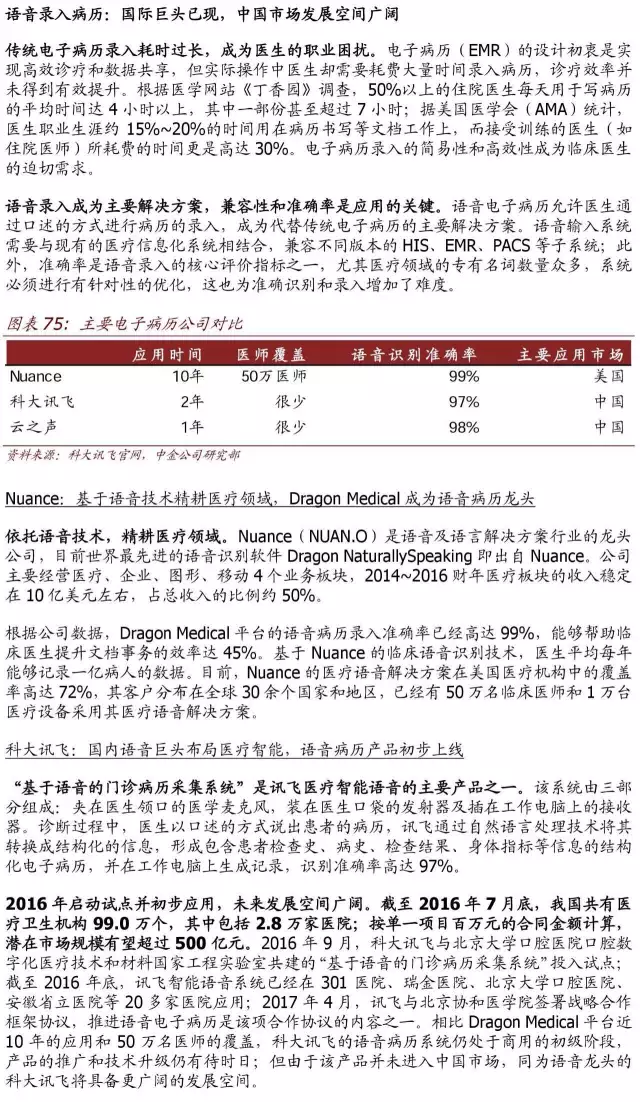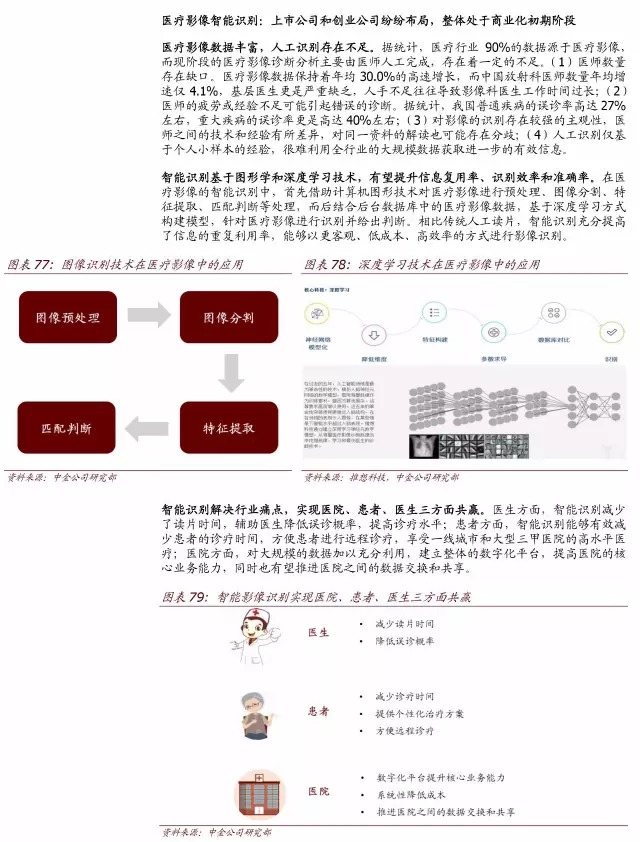 医疗行业空间巨大,但技术还有待成熟。电子病历的建立,不仅仅用到了语音识别技术,也整合了医疗大数据;影像诊断则用到了图像识别技术,现在在国内外都已经形成成熟 的商业模式。辅助治疗和手术机器人由于技术的尚不完善,还在小范围推广。由于语音 识别技术和机器视觉技术的成熟,大量应用这两个技术的行业将迎来 AI 变现的更多机会。