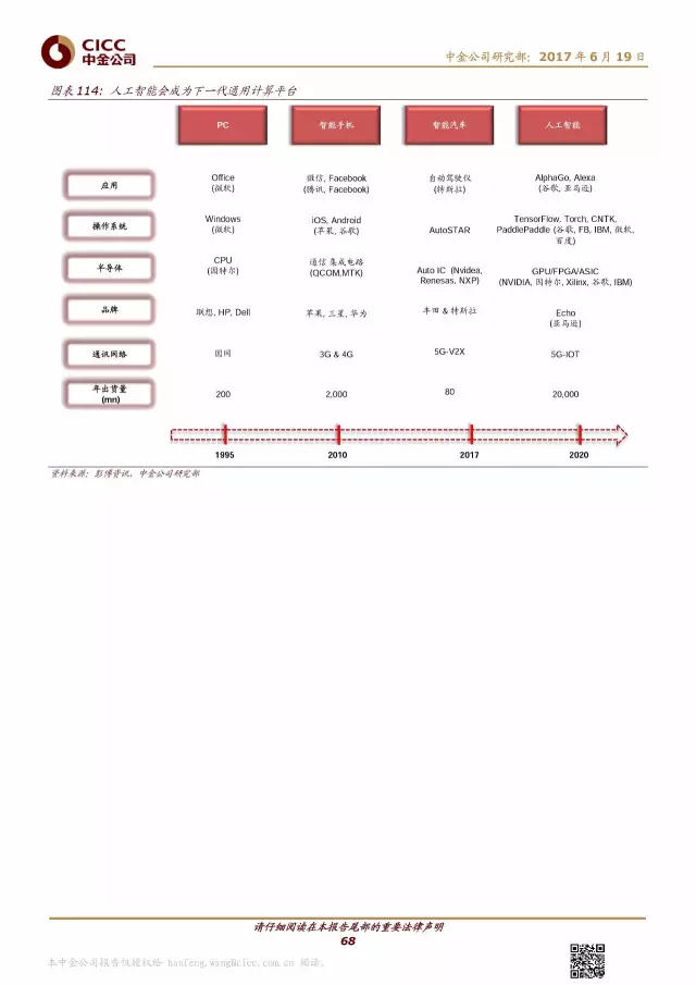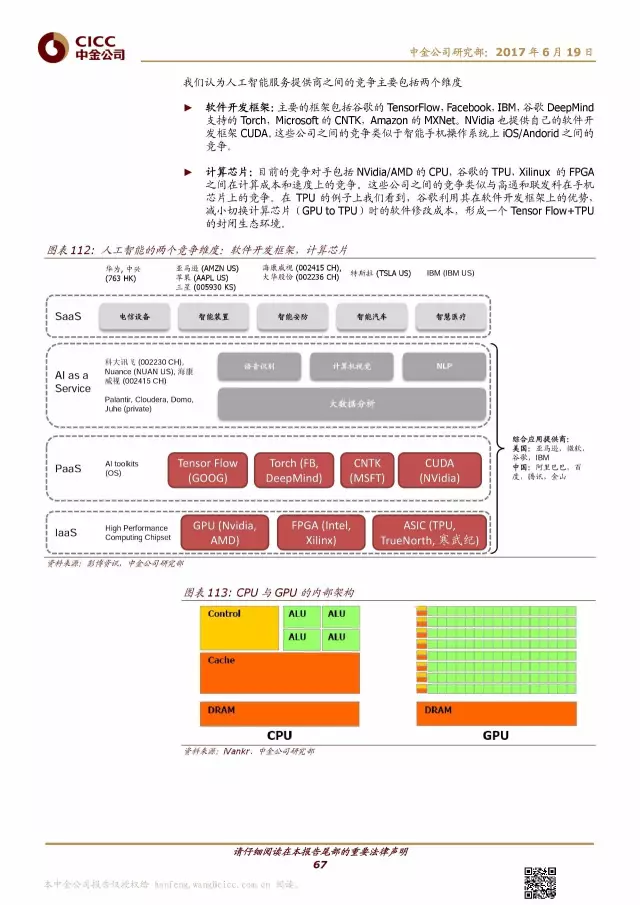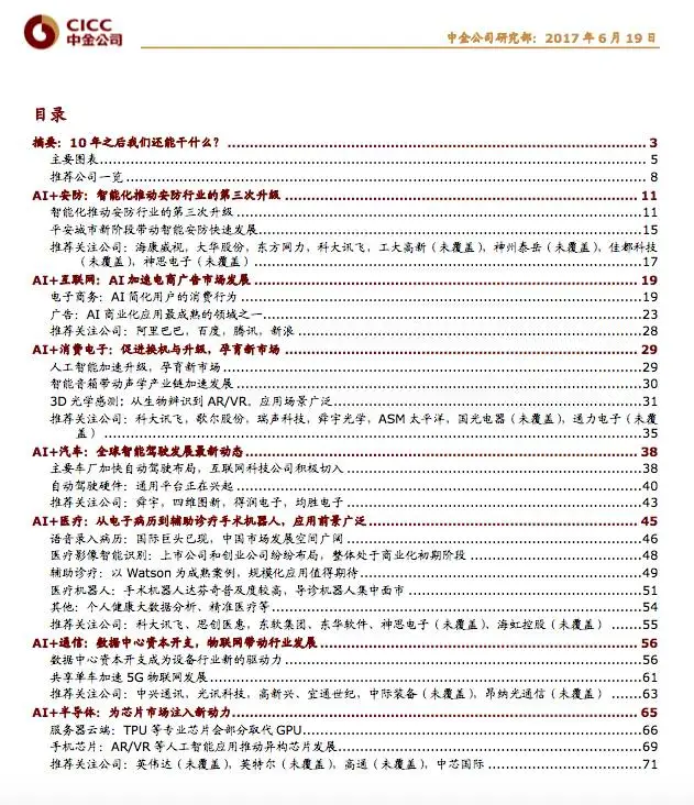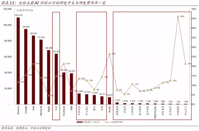 中金公司(CICC)6月19日发布了一份长达71页的人工智能的证券研究报告。对全球特别是中国企业当下的人工智能态势作了全面的介绍:包括BAT、华为、科大讯飞、海康威视等企业的市值、研发投入开支与研发费用率以及排名等详细信息。报告涉及安防、互联网、消费电子、汽车、医疗、通信、芯片7大行业。文章不乏非常有洞见的观点,比如:TPU等专用芯片会部分取代GPU等。这一报告是2017年以来对AI行业发展研究得最为全面和透彻的研报之一,强烈推荐。
