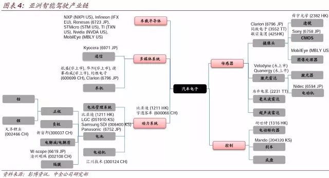 下图归纳了亚洲自动驾驶/电动车产业链的情况。