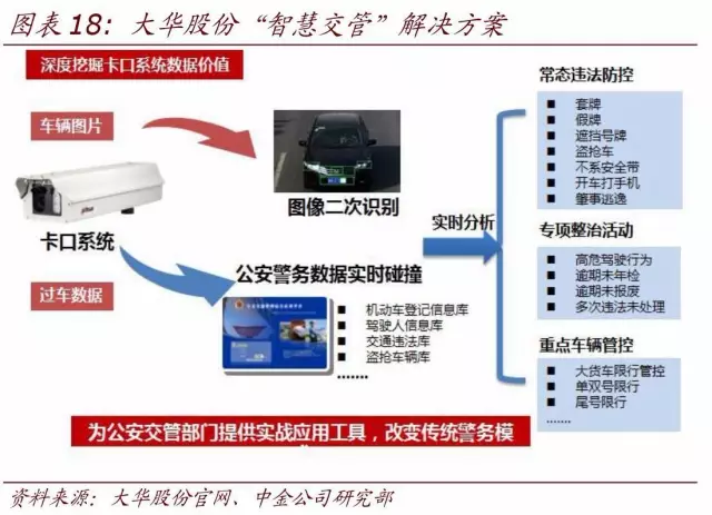 根据我们调研,目前人工智能相关产品主要目标市场是政府市场。其驱动力来自于各地 政府强化各类平安城市相关工程。经过十几年的平安城市建设,中国的主要城市已经积 累了强大的视频数据采集能力。如何利用采集到的数据解决交通拥堵及治安问题一直是 各地政府有待解决的问题。基于人工智能的新一代视频分析技术为城市管理开辟了一条 新的路径。并将驱动当前 67 亿美元的中国安防设备市场继续以年增速 15%以上增长。 其中,交通管理和公共安全等政府相关项目(约占整体市场规模 30%)是最主要的应用 领域。以下是在交管和公安现场的实例。