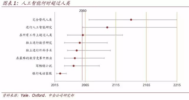 根据耶鲁大学和牛津大学的研究人员对 352 位人工智能专家进行了采访,人工智能到2060 年前后有 50%的概率完全超过人类。这份研究预测在 10 年内,人工智能将会在以 下领域超过人类:翻译领域(2024),高中水平的写作(2026),驾驶卡车(2027)。