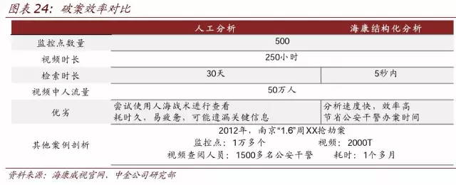 另一个案例是,2012 年的“1.6 苏湘渝系列持枪抢劫杀人案”,当时对 1 万多个监控点产 生的 2000 多 T 数据进行人工查阅,投入了 1500 多名干警耗时一个多月。根据海康威视估算,如果采用人工智能分析仅需要几分钟。