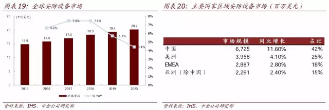根据 IHS 统计,2016 年全球安防设备市场规模达到 158.6 亿美金,同比增长 6.6%。其 中中国市场最大,市场规模 67.25 亿美金,同比增长 11.6%,占全球 42%。美洲市场第 二,市场规模 39.6 亿美金,同比增长 4.1%,占全球 25%。