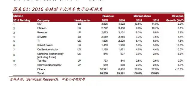 中国在动力电池技术上全球领先,但在 汽车电子上相对薄弱,主要平台目前掌握在 Continental、Bosch、Denso 等全球一级供 应商手里。中国公司主要作为二级供应商参与到整个供应链中去。中国公司相对较强的 零部件包括:(1)电子传感器(舜宇),(2)车机(航盛,华阳,德赛)。