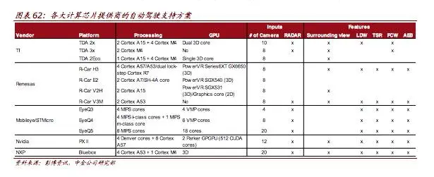 英伟达:在图形处理上先发优势明显,是汽车厂商推进自动驾驶的技术伙伴,目前 已宣布与特斯拉、奥迪、丰田、沃尔沃、博世、ZF 等达成合作。公司推出了车用超 级计算机 Drive PX2,包含有 4 个处理器(2 个 GPU,2 个 Tegra)和 12 个 CPU,每 秒可进行 2,400 万次深度学习计算,以对来自不同传感器的信息作出实时反应。同 时,英伟达通过开放 PX 平台,与相关车厂或一级供应商合作开发快速和定制化的 SoC。