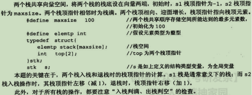 1. 设有两个栈s1、s2都采用顺序栈方式,并共享一个存储区[0,...,maxsize-1],为了尽量利用空间,减少溢出的可能,可采用栈顶相向、迎面增长的存储方式。试设计s1.s2有关入栈和出栈的操作算法。