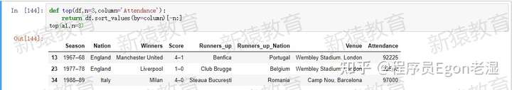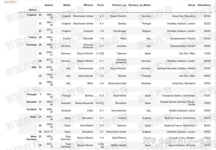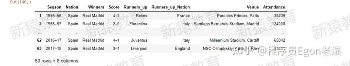 a1.columns=['Season', 'Nation', 'Winners', 'Score', 'Runners_up', 'Runners_up_Nation', 'Venue','Attendance'] # 设置列名