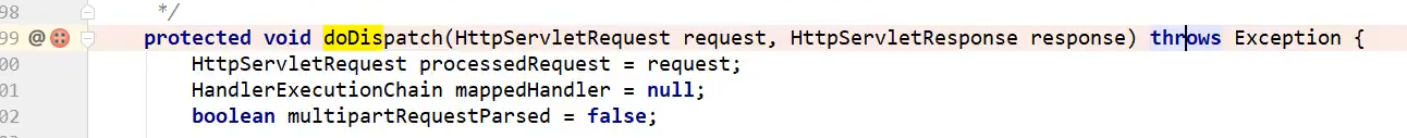 我们给 DispatcherServlet 中的 doDispatch方法 加个断点进行调试一下,因为所有的请求都会走到这个方法中