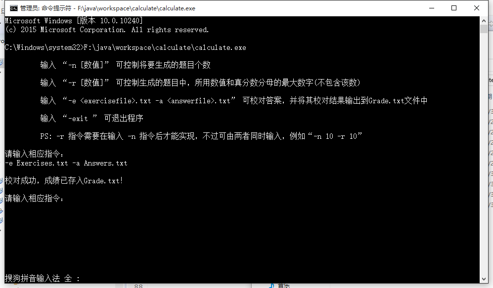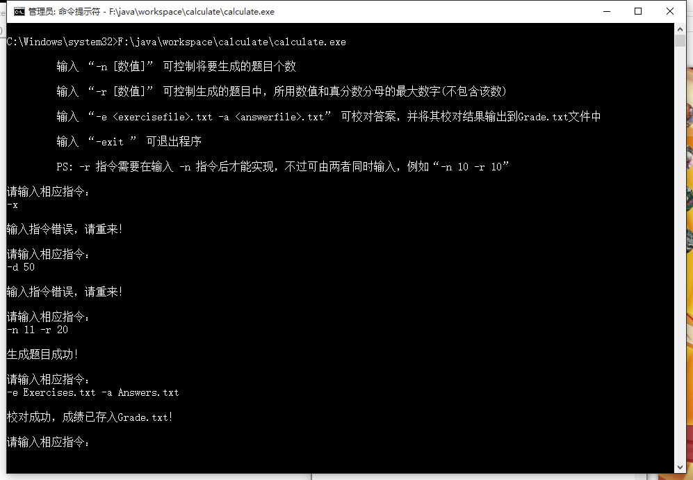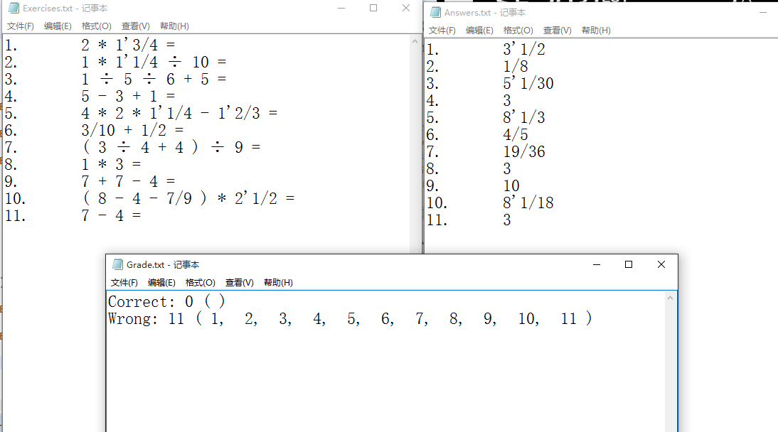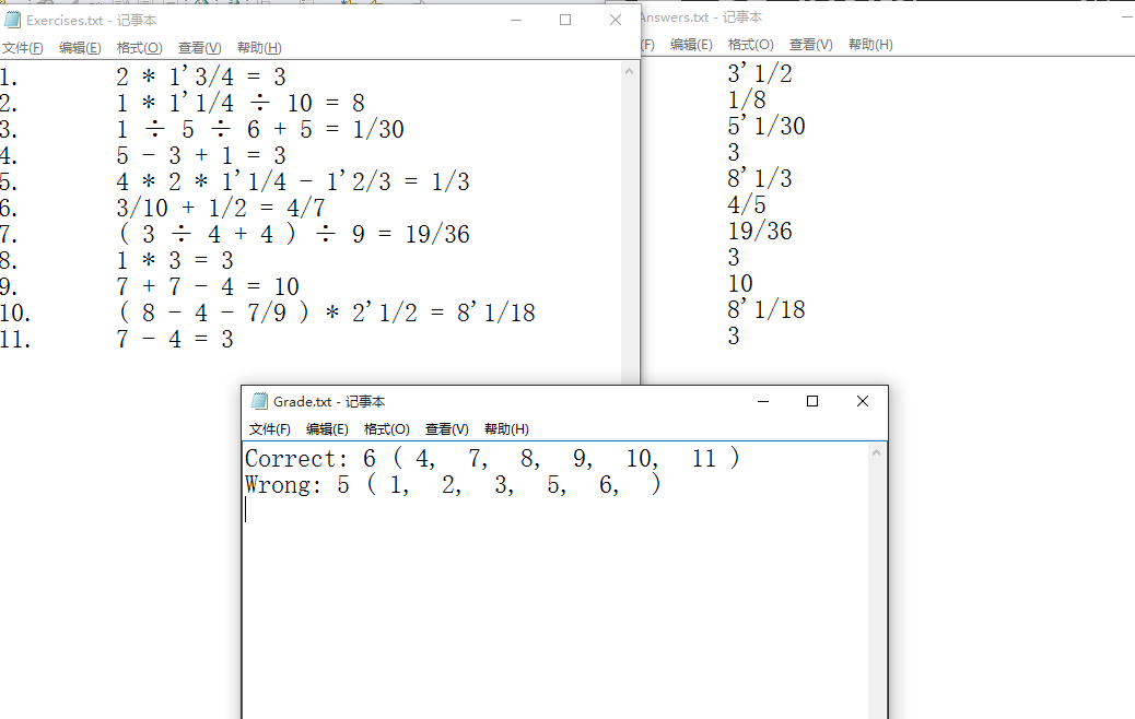 - 程序支持对给定的题目文件和答案文件,判定答案中的对错并进行数量统计,统计结果输出到文件Grade.txt。