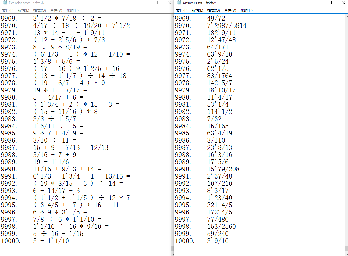 - 在生成题目的同时,计算出所有题目的答案,并存入执行程序的当前目录下的Answers.txt。
