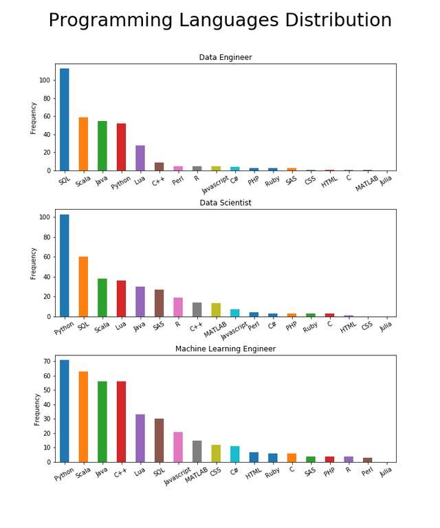 当我们研究分析不同职位时发现,Scala要么的重要性排在第二或第三。因此我们可以,数据科学领域中排名中前三的语言是Python、SQL和Scala。如果你打算学一门新语言,可以试试Scala。