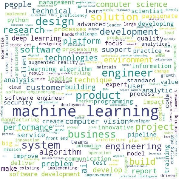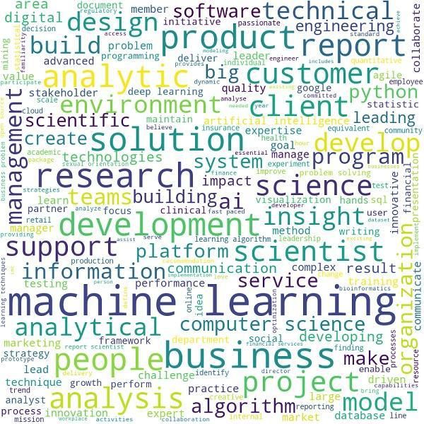 接下来,我们使用词云来分析每个职位最常用的关键词,并结合相应的技能为所有数据科学角色构建理想的技能清单!