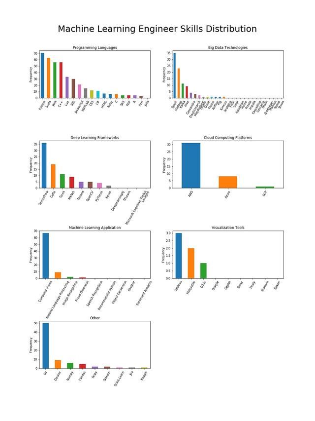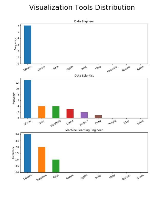 在招聘中,数据科学家大多都要求需要掌握可视化工具,而很少要求数据工程师和机器学习工程师掌握。然而对以上每个职位来说,Tableau都是首选。对于数据科学家,Shiny、Matplotlib、ggplot和Seaborn都同样重要。
