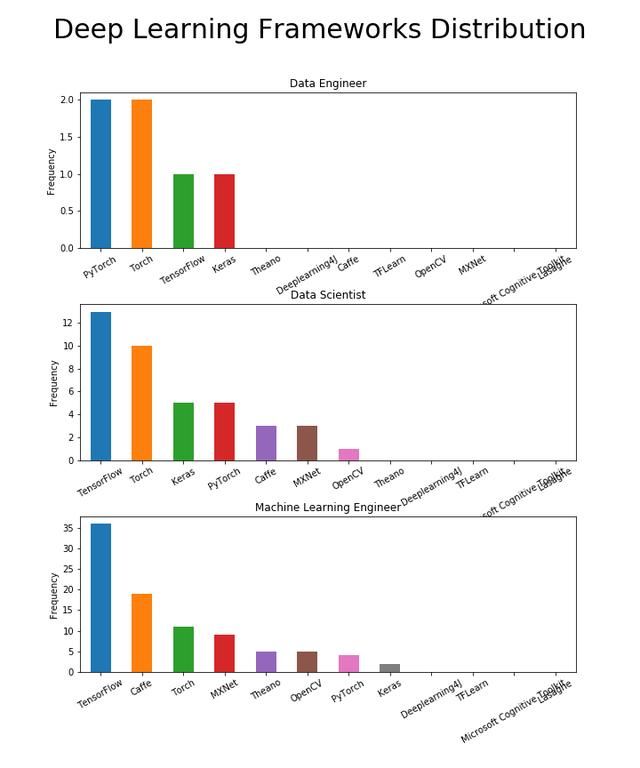 在数据工程师的招聘中很少提到深度学习框架,因此该职位可能不需要用到深度学习框架;在机器学习工程师招聘中,常常提到深度学习框架,这表明机器学习工程师需要常常处理机器学习建模,而不仅仅是模型部署。