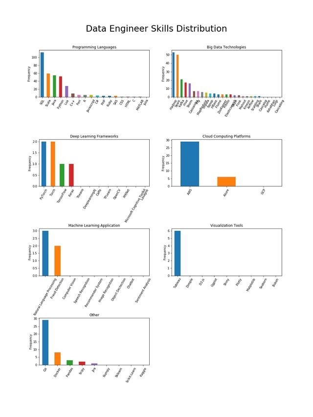 与机器学习工程师相比,数据工程师的技能要求更集中。重点是通过设计和开发管道来支持产品、系统和解决方案。最主要的要求包括:技术技能、数据库、构建、测试、环境和质量。机器学习也很重要,可能是因为构建管道主要为了支持机器学习模型部署数据需求。