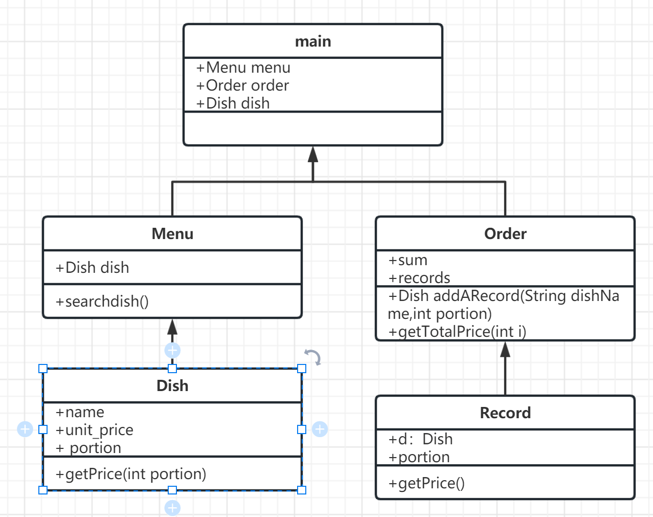 这道题是我第一次运用“类”来完成程序的编写。由于了解到类中的属性可以是新定义的其他变量,也可以是调用的其他类,我将菜单计价分为五个"类",分别是main类、Dish类、Menu类、Record类、Order类。基本思路是main类完成程序的运行,Menu类完成菜单的制作,