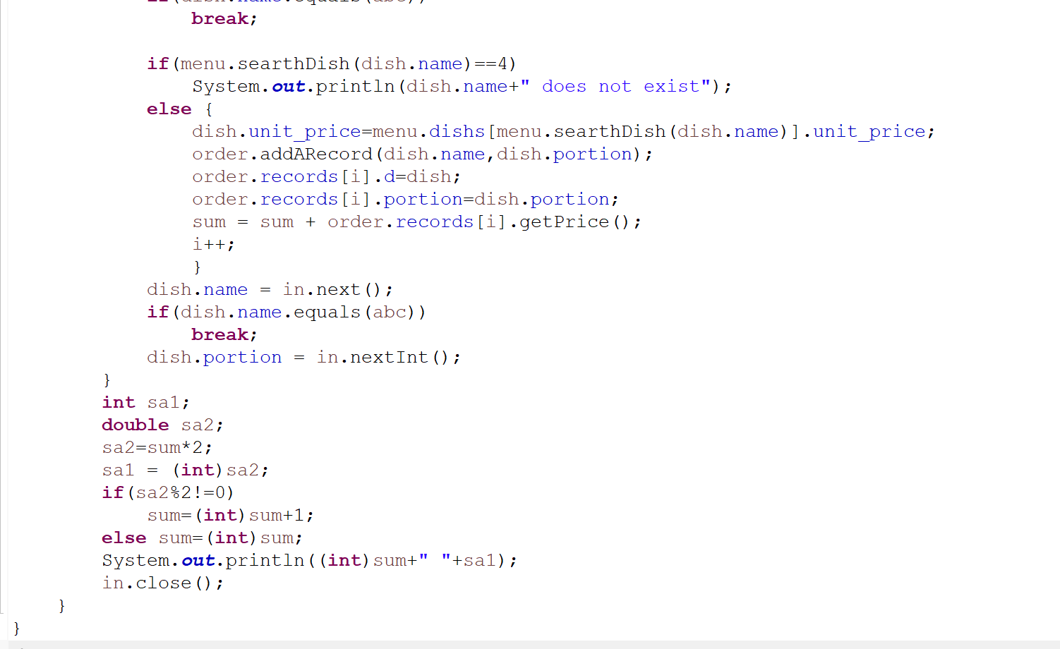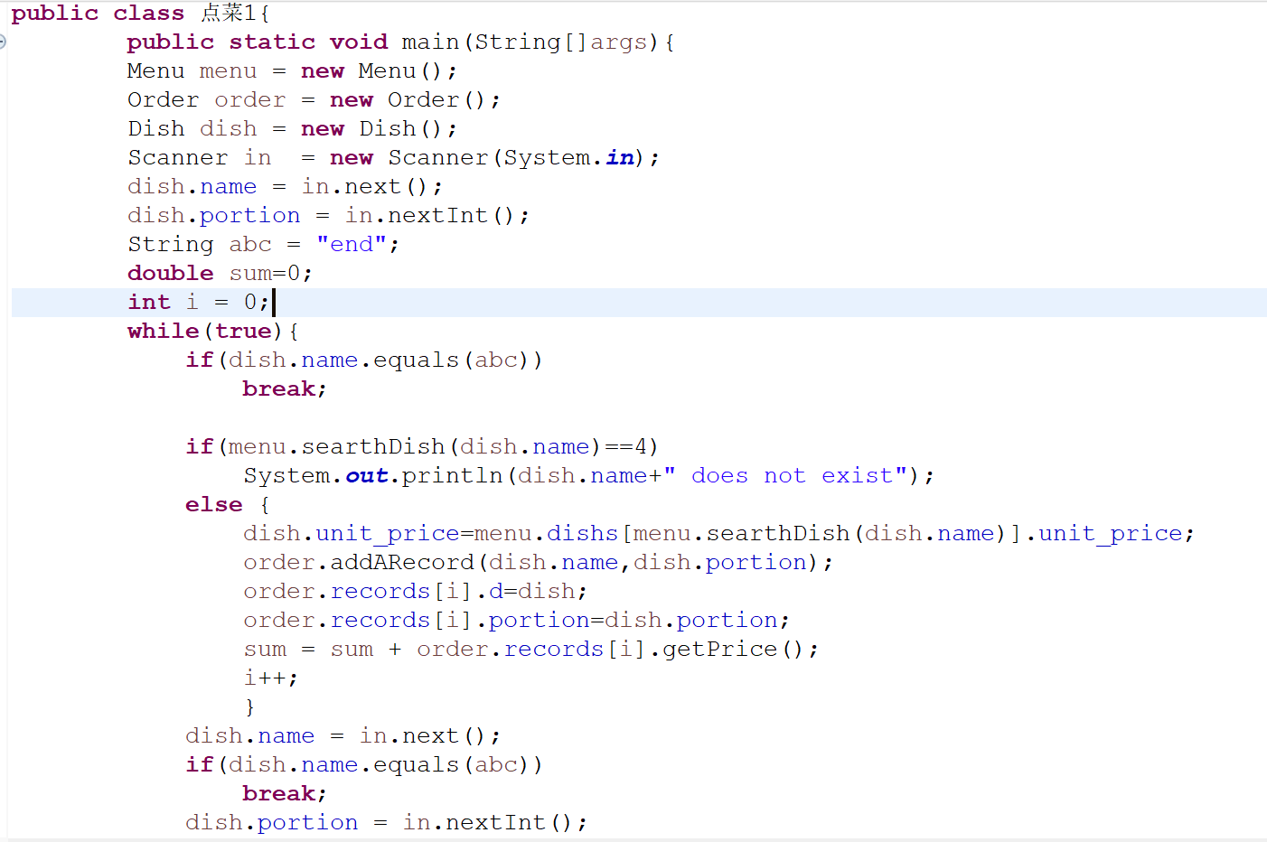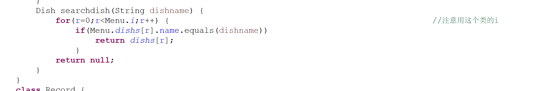 由于该题会出现输入的菜品不在菜单上的情况,所以我在menu类中加了searchdish方法,来判断输入的菜品是否在菜单上,若在菜单上那么该菜品的价格就是所需要的数据,如果再次调用方法就显得繁杂了,所以我将该方法设为有返回值,且返回值就是该菜品,而如果不在菜单上那么返回null就能分辨出来