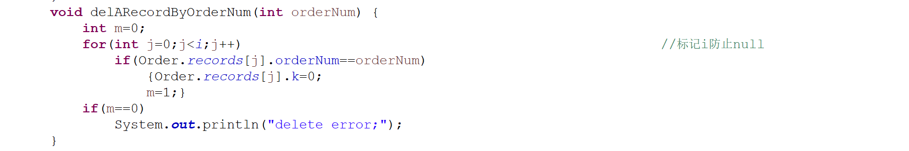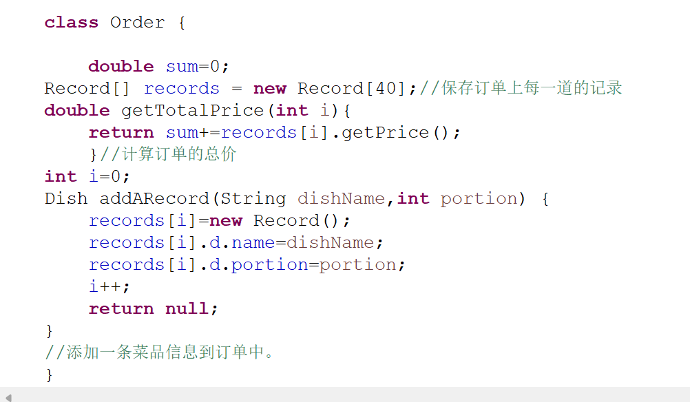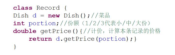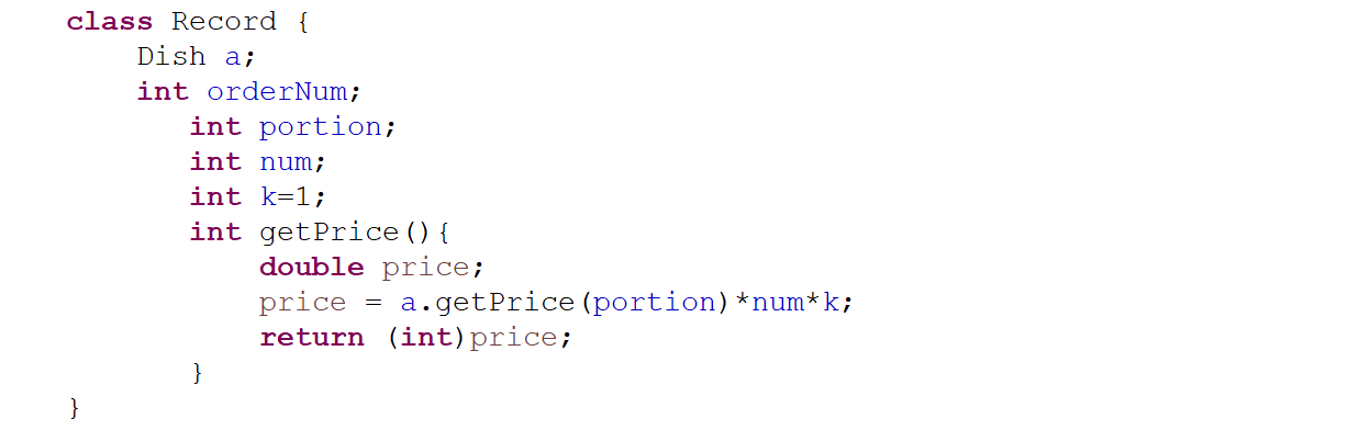 而为了解决会有删除菜品记录的问题,我在record类中加入了k属性,在一般情况下k是等于1的,作为因数加入到getprice方法中,而一旦该记录被删除,k的值变为0,达到删除后有记录但不计价格的效果,同时加入num属性,进行菜品订单的编号