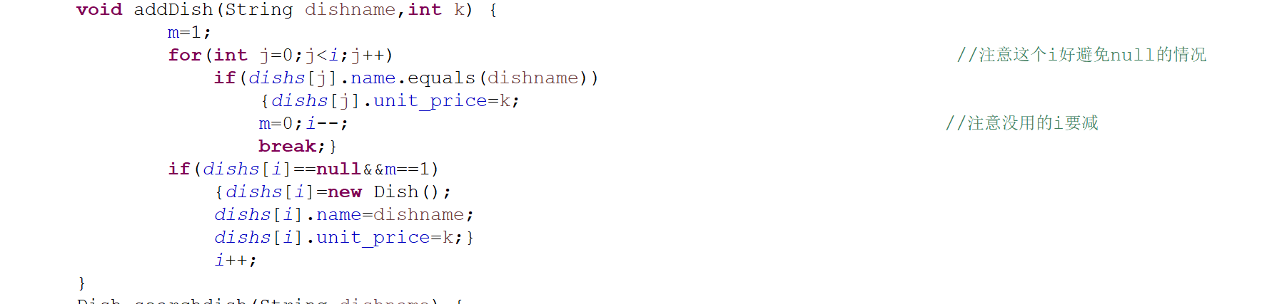 相较于之前的代码,我一开始以为只要用增加方法addDish(),在方法中用for循环通过含参方法把所输入的数据传入Menu对象中即可,但问题是经过调试发现每次传的数据只存在于dish[0]中,其余的dish属性中并未储存数据,后来发现用于标注角标的“i”在每次调用方法时都是0,因为每个dish属性中的i都是独立的,它们之间毫无关联,于是我将角标i移至menu类中,并标记为静态变量,确保i是递增的。但在main类中调用该方法时依旧出现dish[i]=null的情况,经过排查发现该方法中for语句的结束条件为j<20,但实际输入数据的dish并没有20个,对于没输入数据的dish,在被调用时就会出现dish[i]=null的情况从而报错,