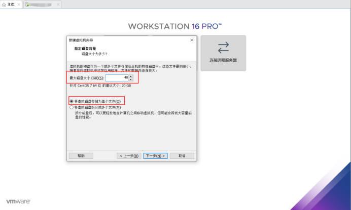 - 为虚拟机配置存储容量,此处的容量为虚拟机在运行过程中的最大容量,点击下一步--》完成;