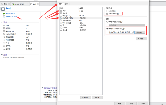 - 此处可以修改磁盘、内存、CPU、网络类型等信息,重点是必须选择ISO镜像文件,同时勾上启动时连接,--》确定--》开启虚拟机