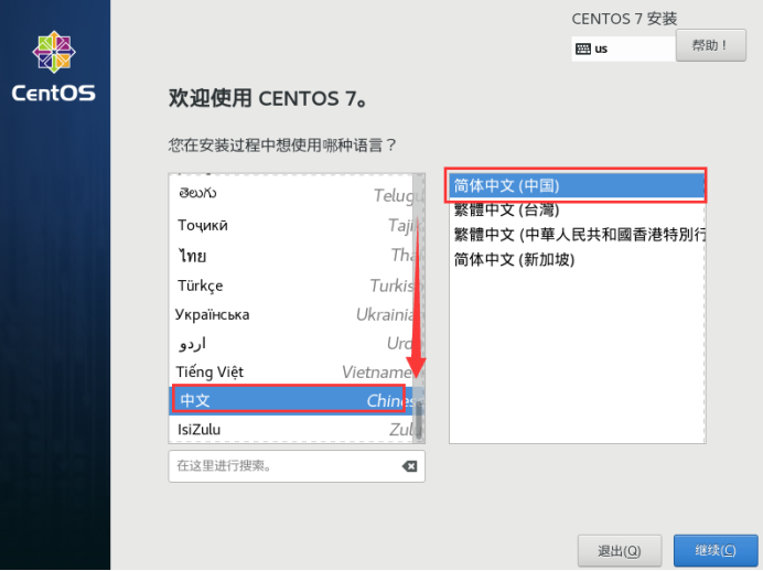 - 根据需要选择语言,一般选择“英语\中文”,此处选择“中文”-->继续