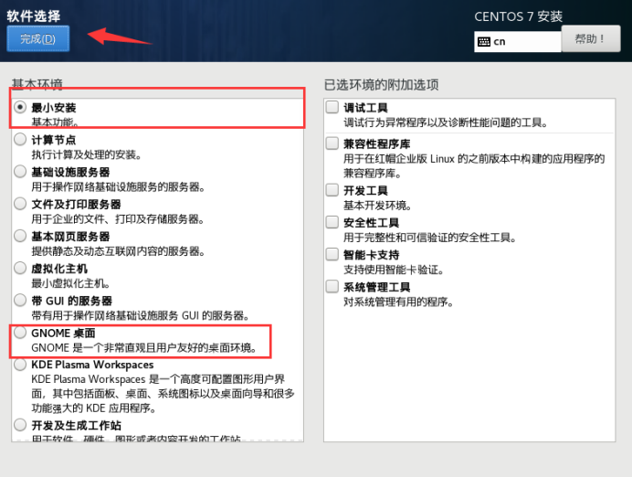 - 选择“软件安装”,根据自己需要选择安装类型,可以在此处选择桌面版(图形化界面)、最小安装(指令界面)等--》完成