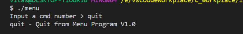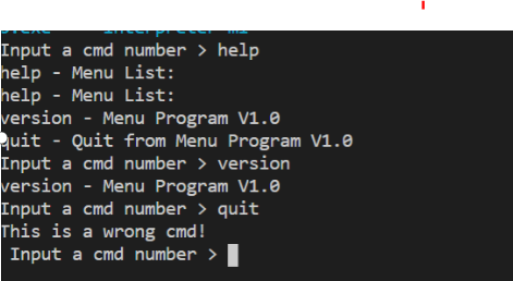 int main() { InitMenuData(&head); /* cmd line begins */ while(1) { printf("Input a cmd number > "); scanf("%s", cmd); tDataNode *p = FindCmd(head, cmd); if( p == NULL) { printf("This is a wrong cmd!\n "); continue; } printf("%s - %s\n", p->cmd, p->desc); if(p->handler != NULL) { p->handler(); } } }