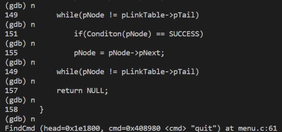 2.1、使用GDB断点调试gcc -g linktable.c menu.c -o menu gdb menu,可以首先定位到menu.c的主函数main中,发现当tDataNode 类型的指针p为NULL时,报出This is a wrong cmd!信息,而指针p的值来源于函数FindCmd函数,观察FindCmd程序,可以继续定位到linktable.c文件中的SearchLinkTableNode函数