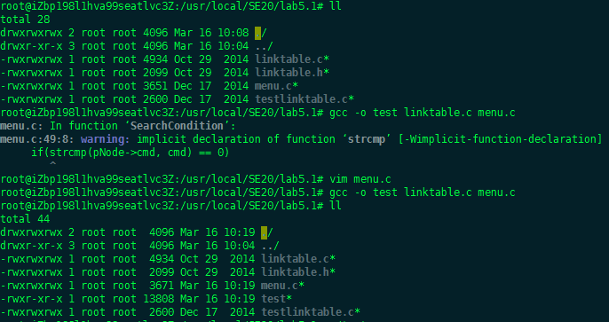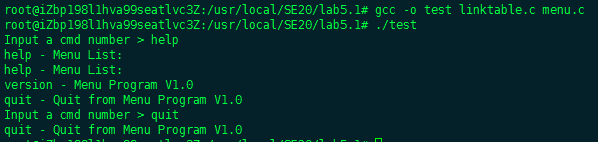 1.2、使用gcc编译程序linktable.c和menu.c,即使用命令gcc -o test linktable.c menu.c,将linktable和menu.c编译成可执行文件,名为test。