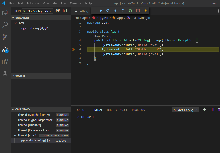 然后我们利用Debugger for Java插件的功能可以进行简单的调试,包括断点,前进,后退等,左边显示本地量,terminal显示执行结果等。