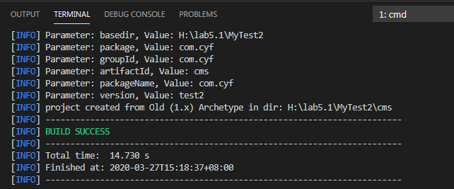 接下在command窗口查找maven找到快速创建maven项目功能,在输入几个关键的参数后(groupId、artifactId、package等,例如: