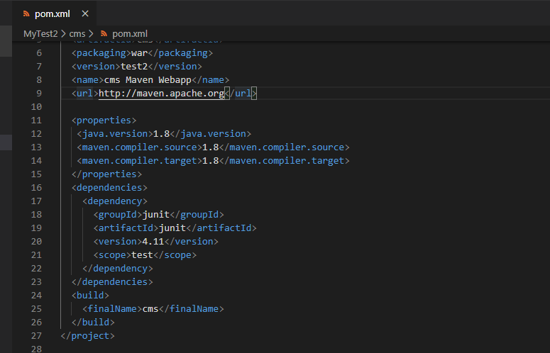 4.1、首先在pom.xml文件添加设置配置包括Java版本,junit版本