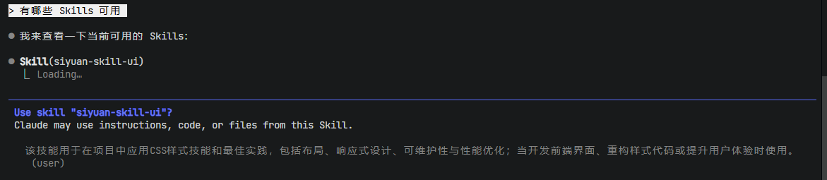 - 重启 Claude,然后询问:“有哪些 Skills 可用?”