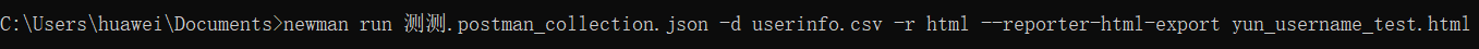 C:\Users\huawei\Documents>newman run 测测.postman_collection.json -d userinfo.csv -r html --reporter-html-export yun_username_test.html