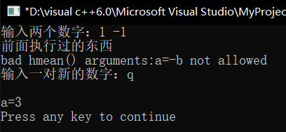 #include<iostream> using namespace std; double hmean(double a,double b) { if(a==-b) { throw "bad hmean() arguments:a=-b not allowed"; cout<<"throw之后还执行"<<endl; } return 2.0*a*b/(a+b); } int main() { double x,y,z; int a=1; cout<<"输入两个数字:"; while(cin>>x>>y) { try { a+=2; cout<<"前面执行过的东西"<<endl; z=hmean(x,y); a++; } catch (char* s) { cout<<s<<endl; cout<<"输入一对新的数字:"; continue; } cout<<"调和均值是"<<z<<endl; cout<<"输入另外两个数字,按q退出"; } cout<<endl<<"a="<<a<<endl; return 0; }